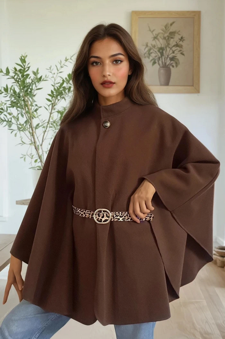 Cape-Jacke in Braun mit Knopf und Leoparden-Gürtel – Stilvoll, edel und wunderbar wandelbar