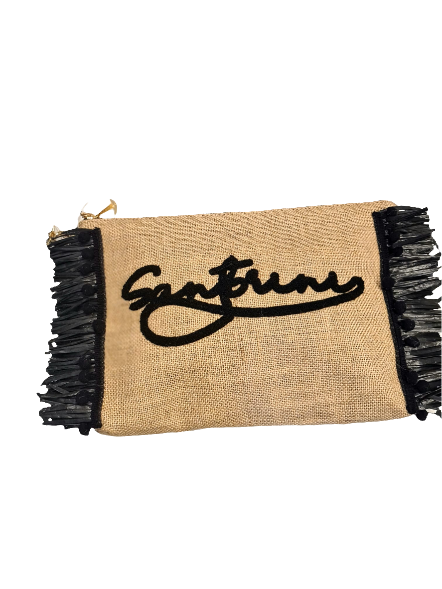 Clutch „Santorini“ aus Jute – mit Fransen & gesticktem Schriftzug