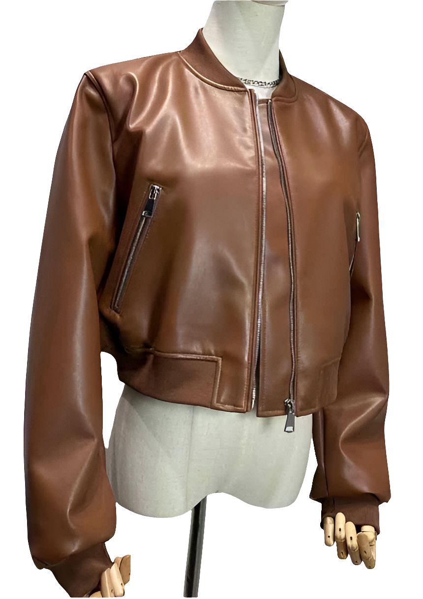 Cognacbraune Kunstleder-Bomberjacke im modernen Cropped-Stil für Damen