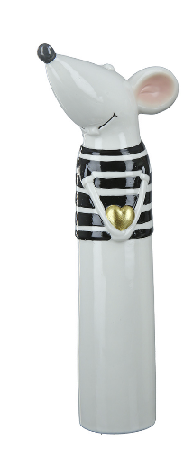 Diese charmante Dekofigur Maus im Streifenlook mit goldenem Herz aus Porzellan bringt sofort ein Lächeln ins Gesicht. Mit ihrem modernen Design – schwarz-weiß gestreiftes Shirt und goldenes Herz – passt sie wunderbar in jedes Zuhause, egal ob auf dem Regal, Sideboard oder als liebevolles Detail im Wohn- oder Kinderzimmer.