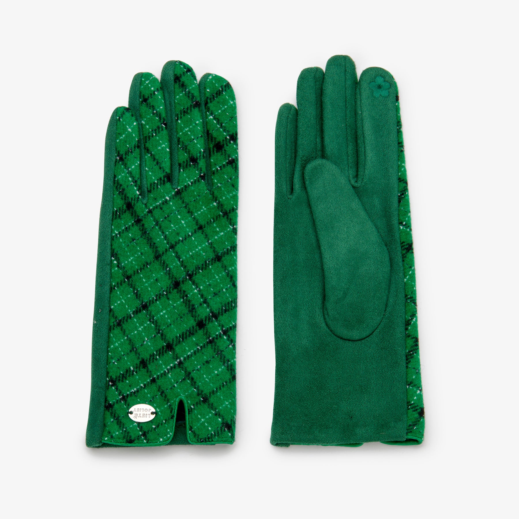 Diese modischen Damenhandschuhe in kräftigem Grün vereinen klassischen Stil mit einem Hauch Extravaganz. Die Vorderseite ziert ein stilvolles Karo-Muster, während die Rückseite schlicht und elegant in Uni-Grün gehalten ist.