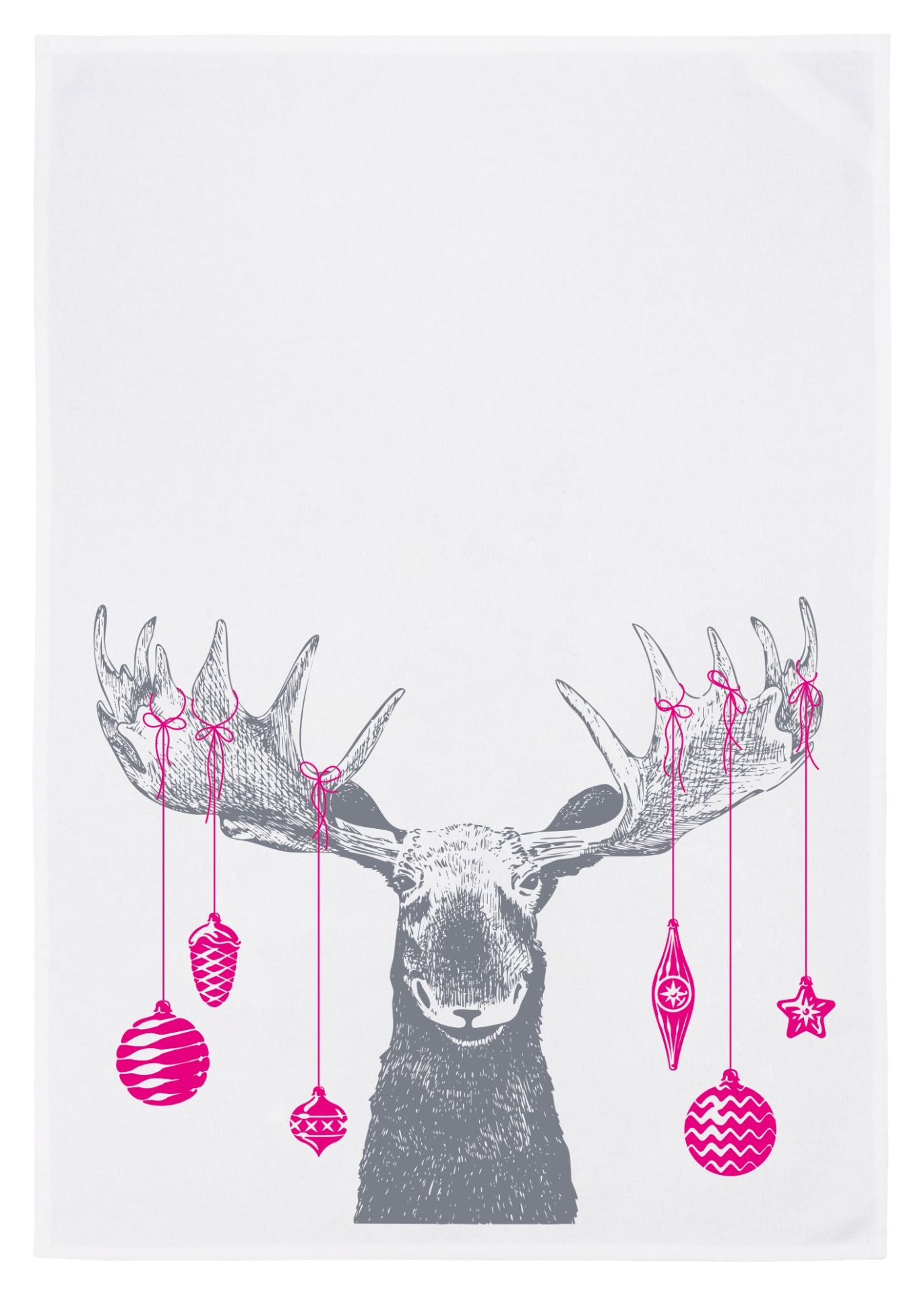 Geschirrtuch weiß – Elch mit Weihnachtsschmuck
