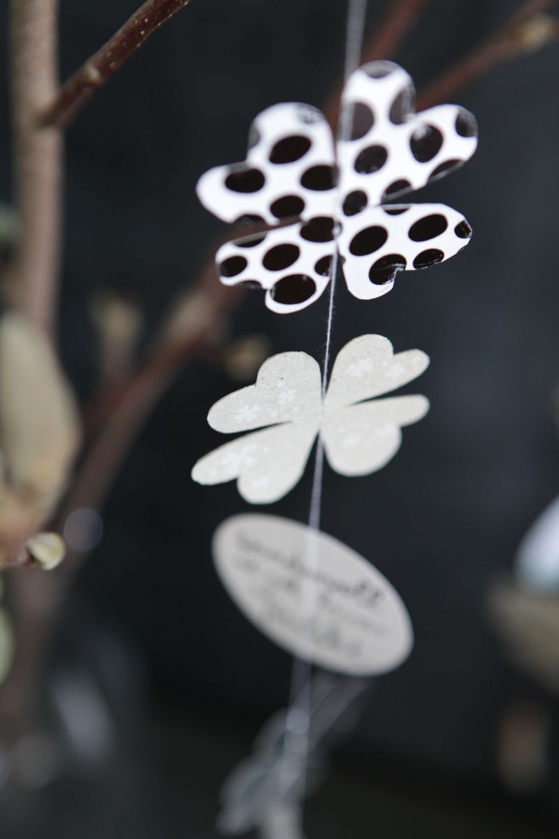 - Liebevoll gestaltete Kleeblatt-Elemente in Natur- und Schwarz-Weiß-Tönen