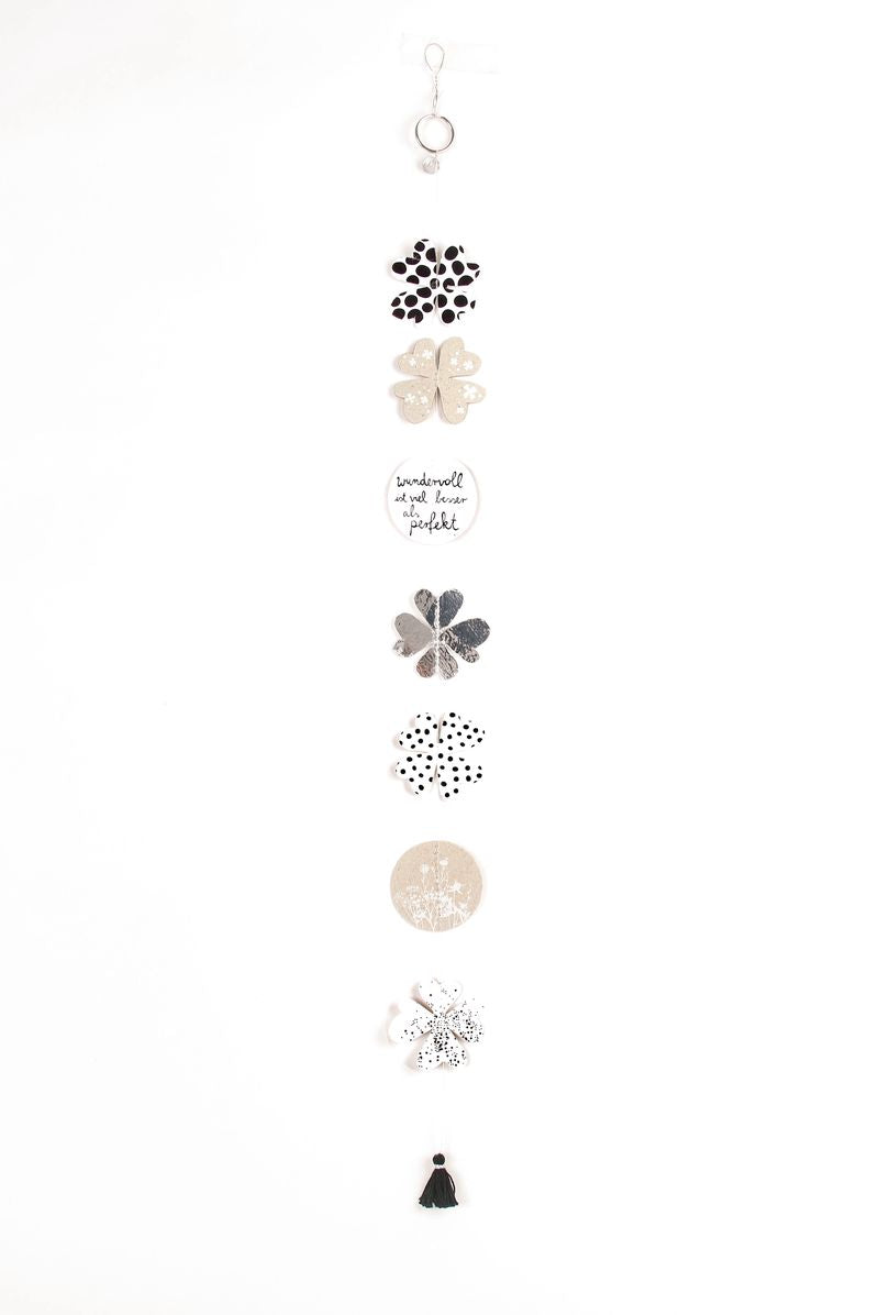 Diese zauberhafte Glückskleekette von Good Old Friends vereint charmantes Design mit einer positiven Botschaft. Verspielte Kleeblätter in unterschiedlichen Mustern und edlen Metallic-Effekten reihen sich aneinander und machen die Kette zu einem besonderen Blickfang – ob im Fenster, am Ast oder als kleine Aufmerksamkeit zum Verschenken.