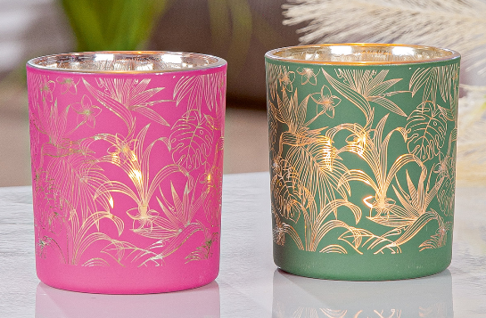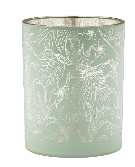 Dieses Windlicht in sattem Grün mit goldfarbenem Tropical-Muster zaubert sofort Urlaubsfeeling in dein Zuhause. Das stilvolle Design mit Palmenblättern und exotischen Blüten wird durch die glänzende Innenverspiegelung edel reflektiert und erzeugt ein besonders warmes, stimmungsvolles Lichtspiel. Ideal als Sommerdeko oder als Eyecatcher auf dem gedeckten Tisch, Sideboard oder Balkon.